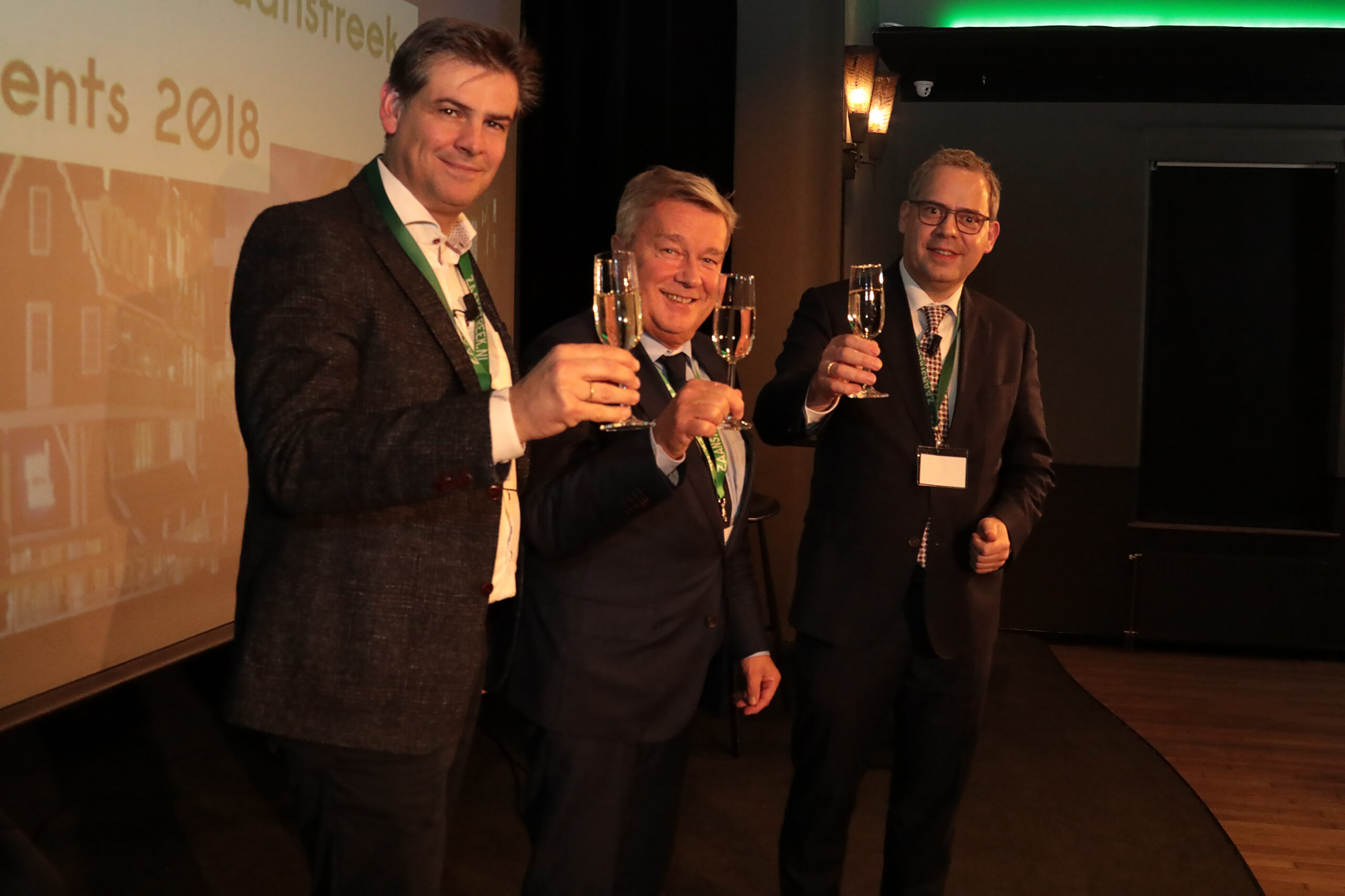 21 november 2017: Presentatie Marketing Zaanstreek 2018. Proosten op de samenwerking tussen SMZ en gemeente Zaanstad. Vlnr: Lex Kruijver, Paul Luijten (beiden SMZ) en wethouder Dennis Straat (gemeente Zaanstad).